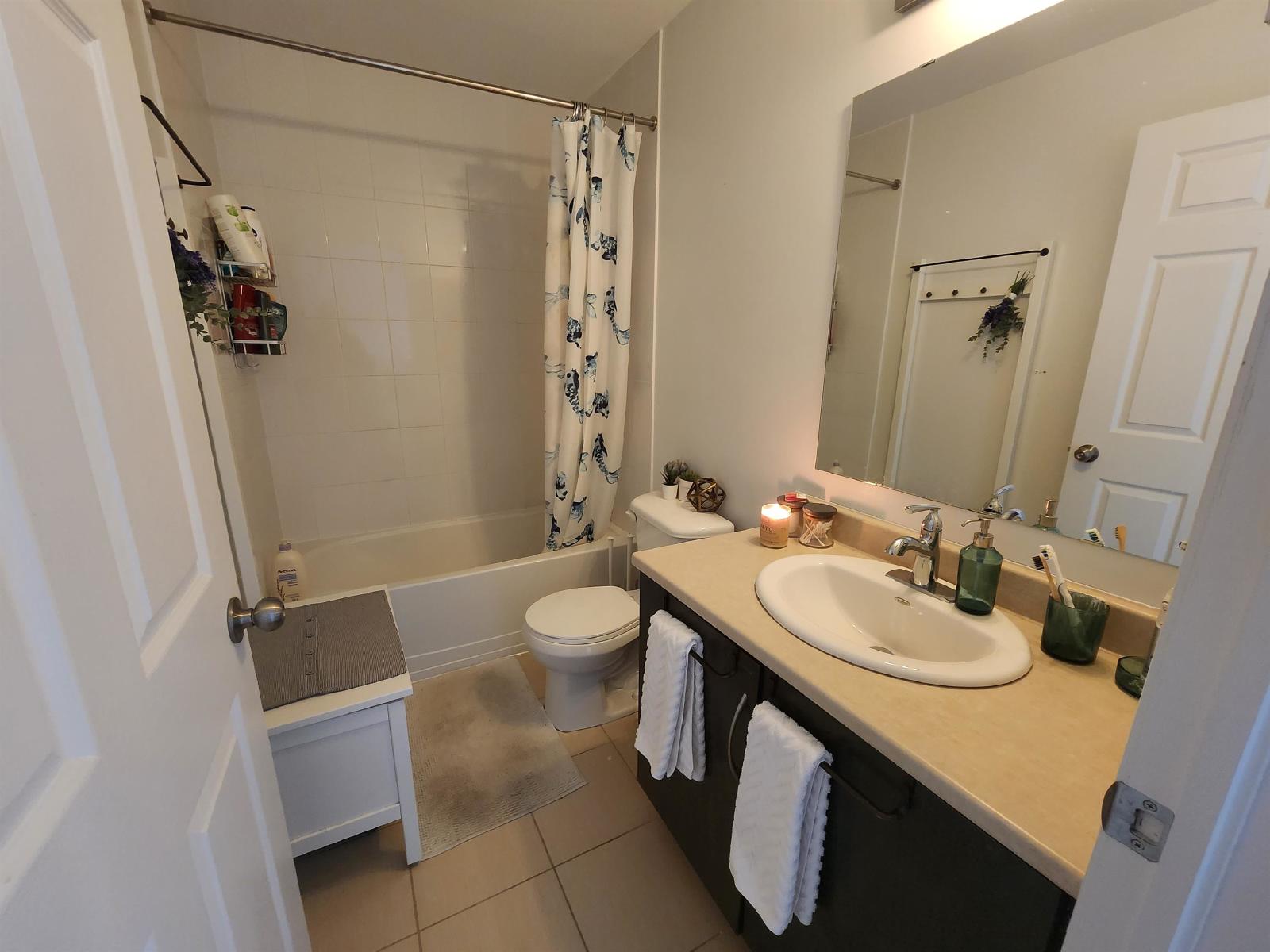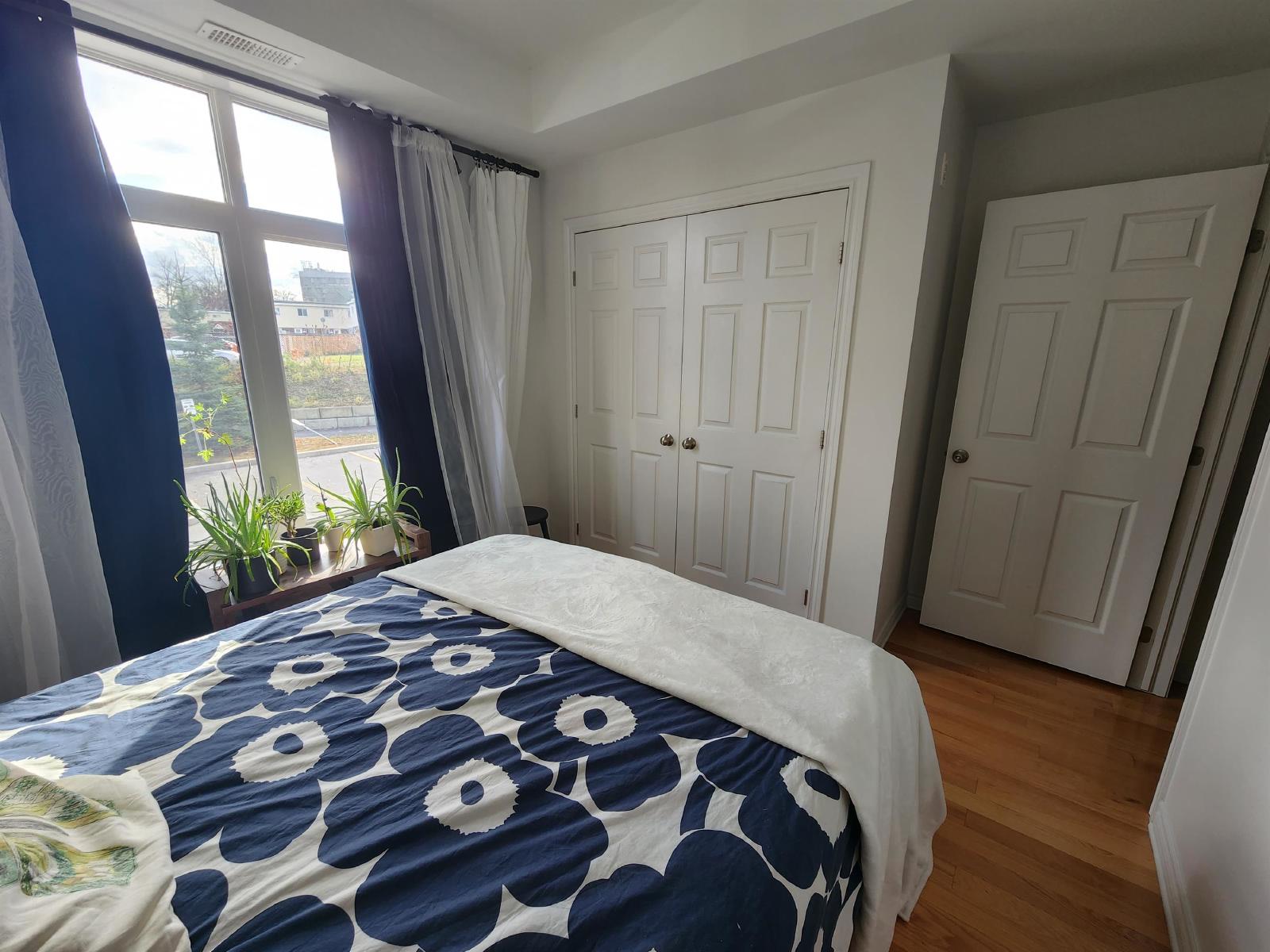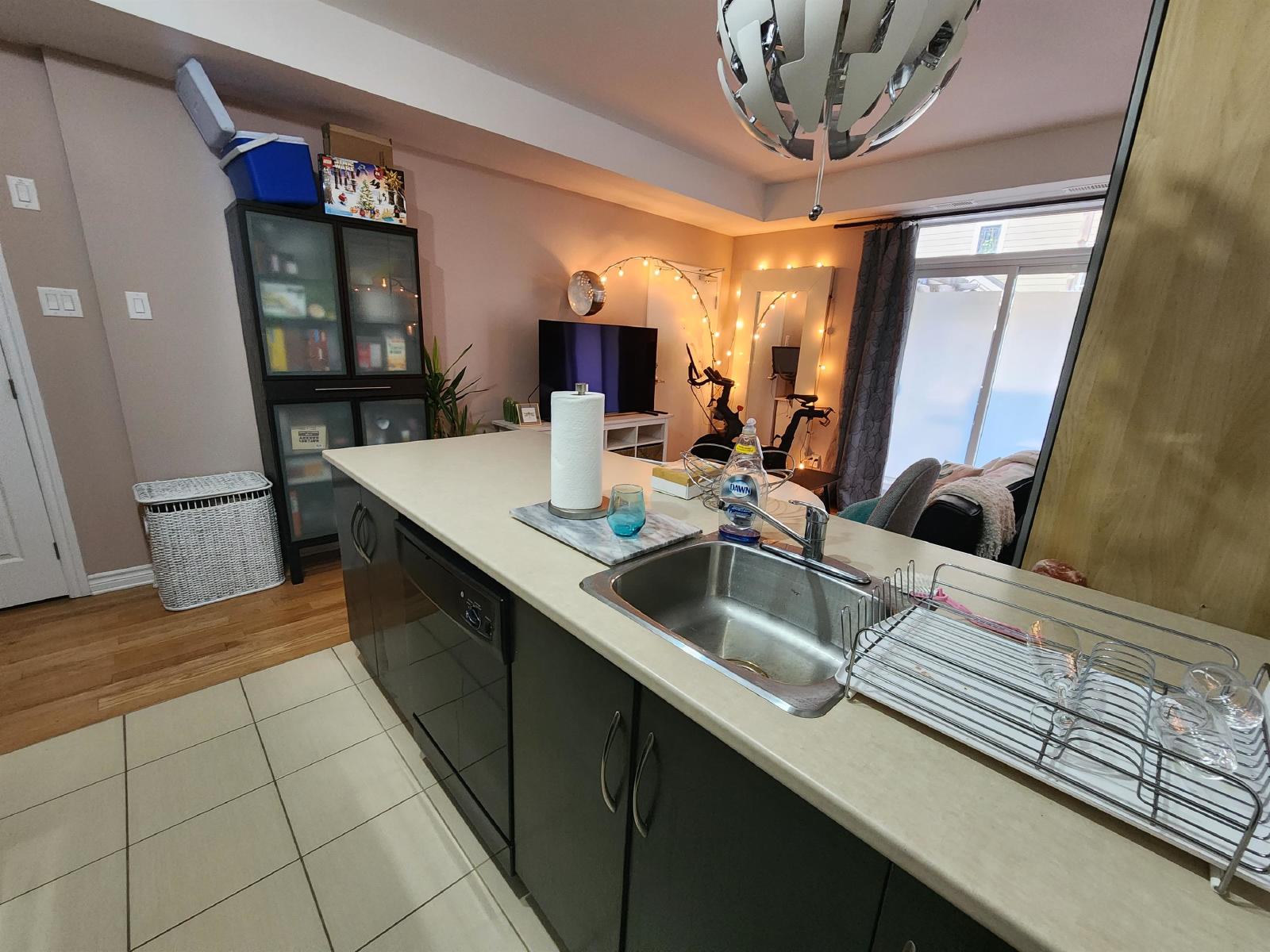 Beautiful 1 bedroom and den located just a few minutes from Trainyards and the highway. The kitchen offers lots of counter and cupboard space, including a breakfast bar. Great size living room with an outdoor space, perfect for a BBQ. The bedroom offers lots of natural sunlight and a great size closet. The den is perfect for an office with glass French doors. Ensuite laundry and 1 parking spot included.