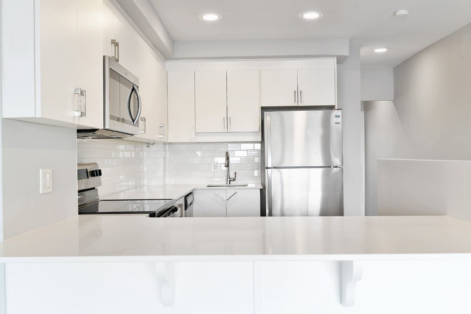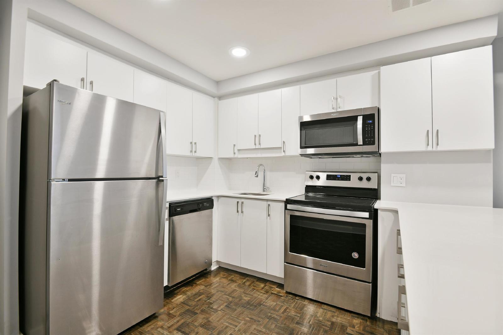 The kitchen is thoughtfully designed with stylish finishes and comes equipped with a dishwasher and microwave—ideal for easy living and entertaining. Large windows fill the space with natural light, complementing the sleek, modern renovation throughout.