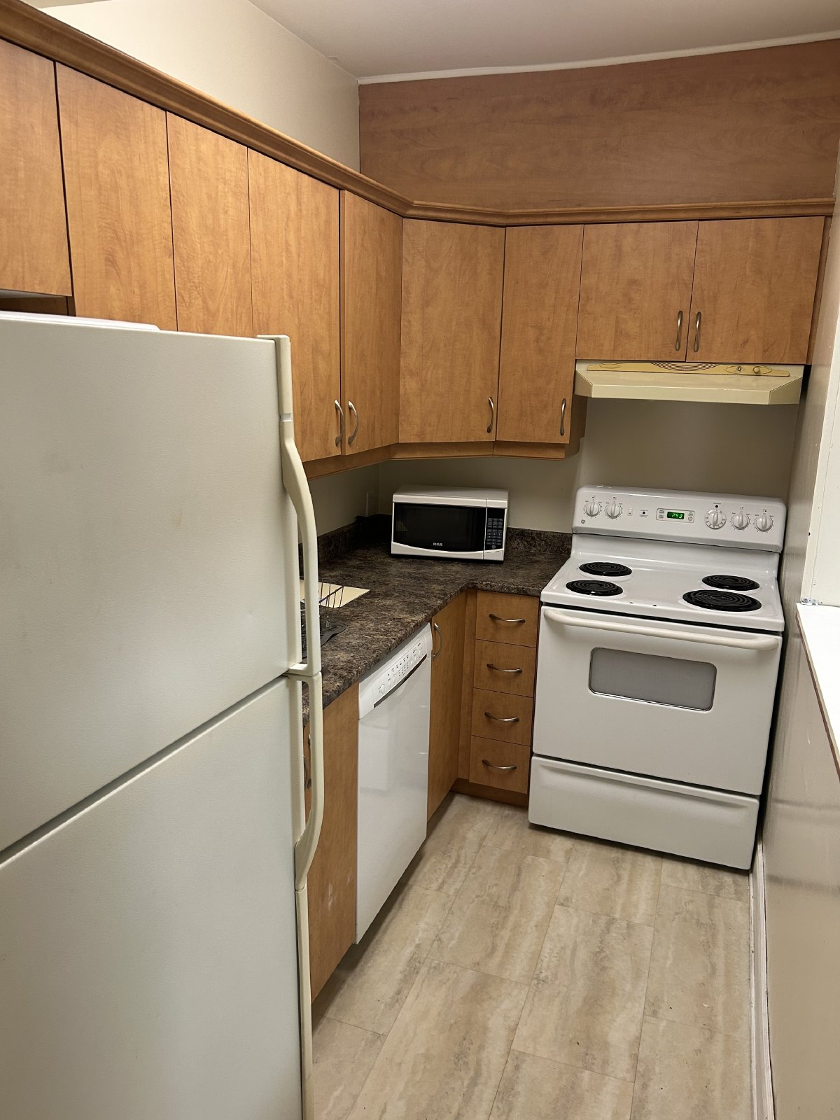 Kitchen comes equipped with fridge, stove/oven and dishwasher (microwave not included)