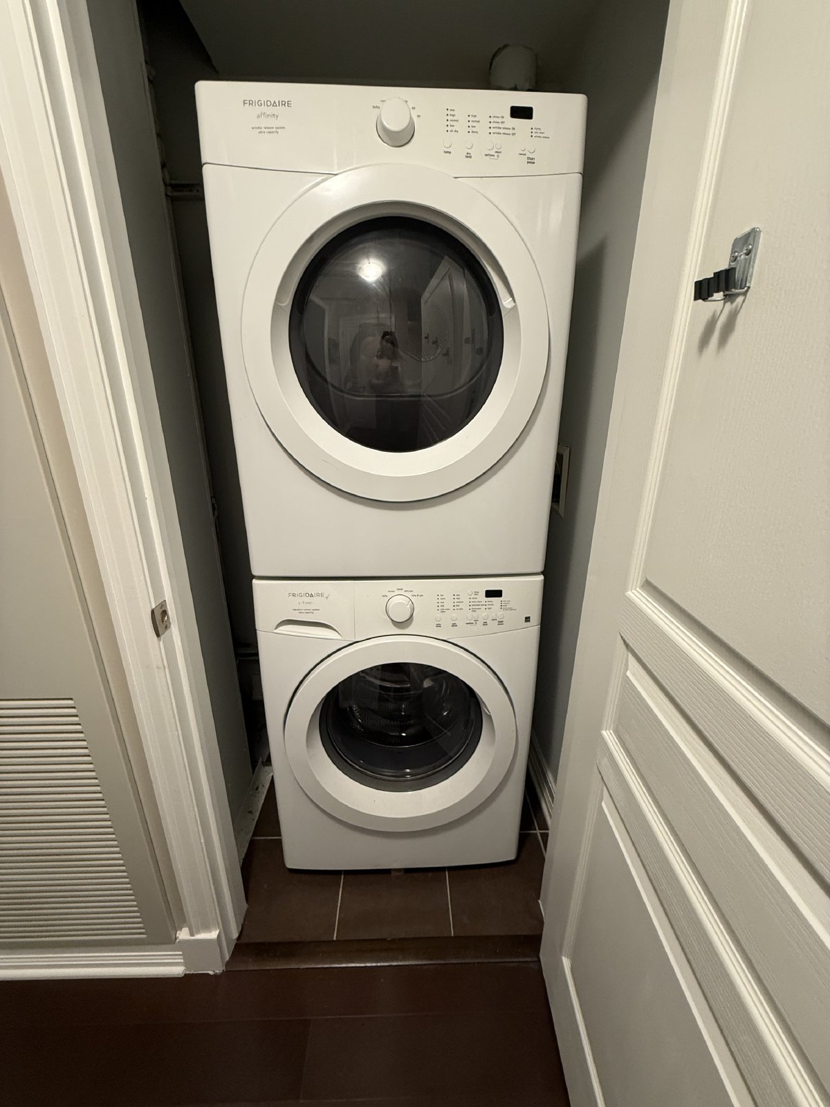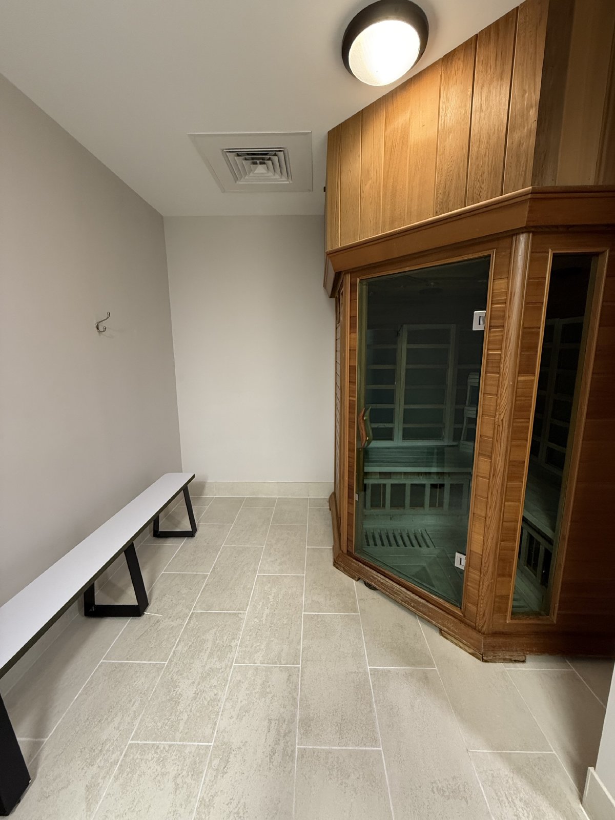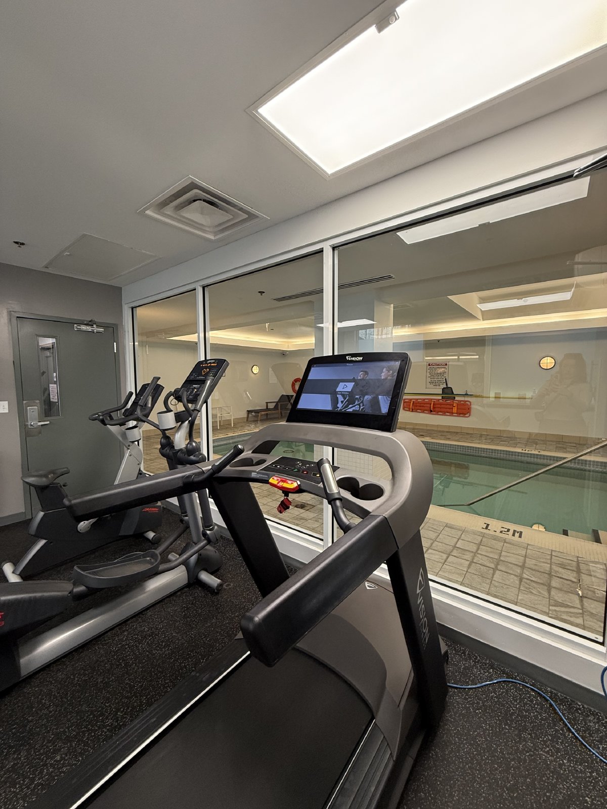 Included with the unit is a dedicated storage locker, and residents have full access to premium building amenities such as an indoor pool, fitness centre, sauna, and shared common space for lounging or hosting small gatherings.