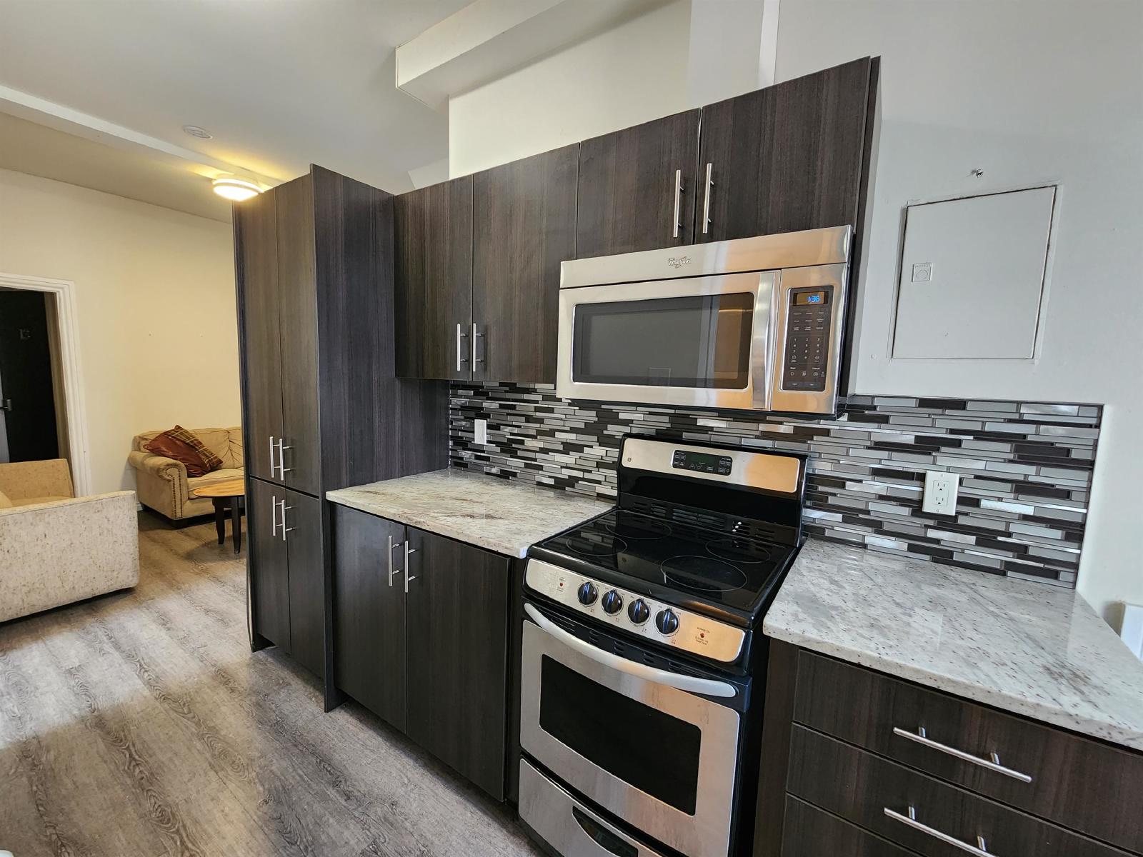 The kitchen is equipped with 3 main appliances including a dishwasher, stove/oven, and refrigerator. Laundry available in the building (Card Operated)