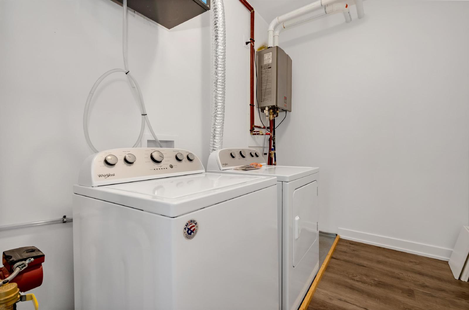 Step inside to find gleaming hardwood floors, a spacious open-concept living and dining area, and a stylish kitchen complete with stainless steel appliances, including a gas stove—perfect for cooking enthusiasts. The primary bedroom features a walk-in closet and a private en-suite bathroom, while a brand-new washer and gas dryer add ultimate convenience.